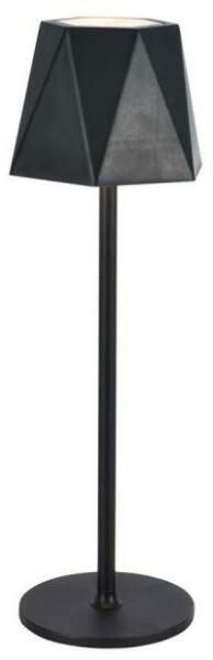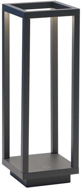 - Modernista és minimalista forma. - A LED fényforrás az alumínium szerkezet felső részében van elhelyezve, lefelé irányítva a fényt. - Magas védelmi tényezőjének (IP54) köszönhetően kültéri használatra is alkalmas. - Az alaplapon található érintőgombbal vezérelhető a be/ki funkció és a fényerősség állítás (dimmer). - Elem élettartama: 12 h. - Méretek: 29 x 10