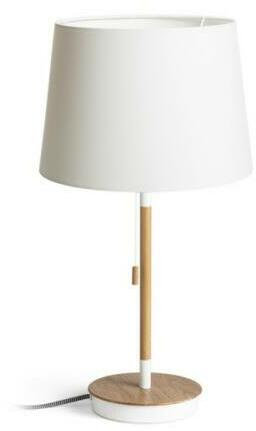 Asztali lámpa textil ernyővel és talpon beépített USB porttal. A talp utánzat bükkfából készült, fehér lakkos részletekkel. Alkalmas LED E27 fényforrásokhoz.
