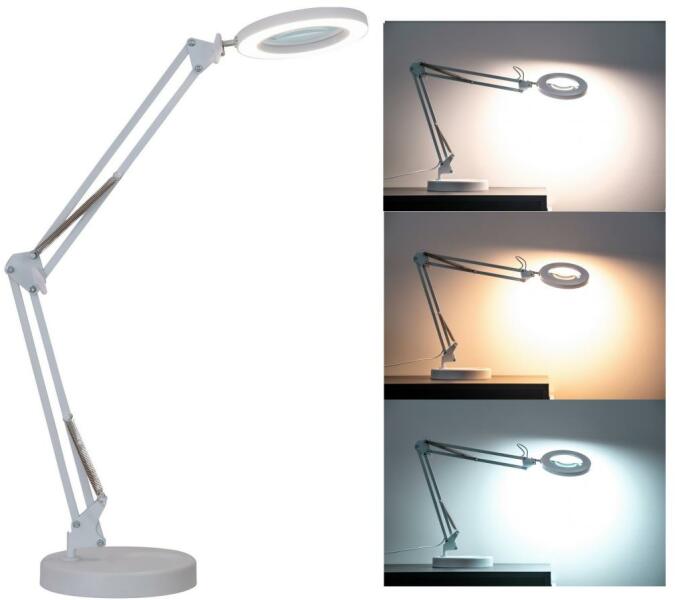 Nagyítóval ellátott asztali lámpa. 3 választható fényszín: hideg fehér (6000K) - nappali fehér (4200K) - meleg fehér (3000K). Dimmelhető - 10 fokozatú fényerősség. A nagyító 5x nagyít. A nagyító átmérője: 10,5 cm. A lámpát asztalra kell helyezni vagy rögzíteni egy bilinccsel. A színhőmérséklet és a fényerősség változtatása a kábelen lévő kapcsolóval. Tápe