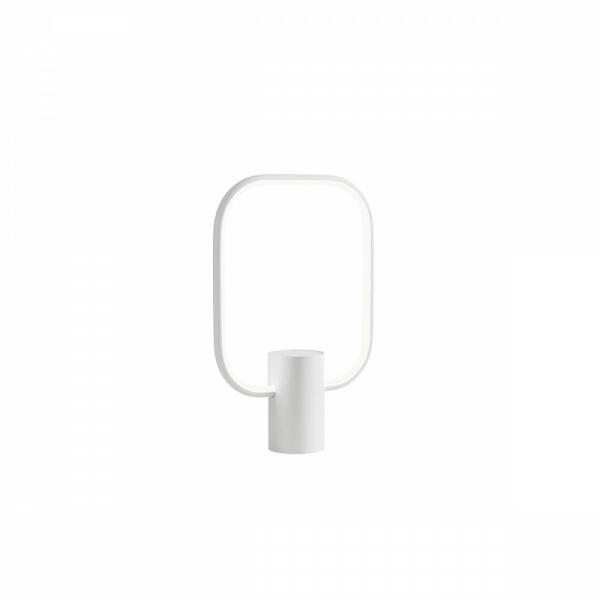 Matt fehérre festett alumínium asztali lámpa fehér színű szilikon betétes búrával, beépített LED fényforrással, vezetékre szerelt kapcsolóval.