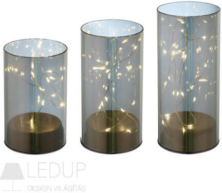 Asztali lámpa szürke műanyag, füst színű üveg, szürke PVC kábel, tolókapcsoló, időzítő, 6 órás időzítő, darabonként 2xAA elem, ø: 80mm, magasságok: 1 x 12,5 cm, 1 x 15 cm, 1 x 17,5 cm, tartozék: 45x LED 0.06W 4.5V, 3000K KIFUTÓ TERMÉK A KÉSZLET EREJÉIG!