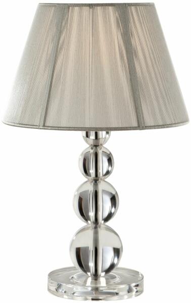 39cm magas, átlátszó acryl bevonatos króm színű fém vázas asztali lámpa ezüst színű textilszálakból álló lámpaernyővel, 1db E27-es fényerőszabályozható E27-es LED fényforrással.