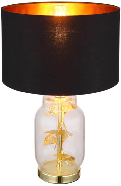 Asztali lámpa sárgaréz színű fém, átlátszó üveg, fekete textil, aranyszínű műanyag, fekete PVC kábel, billenőkapcsoló a kábelen, ø: 250mm, M: 380mm, kábel hossza 1500mm, 1x E27 40W 230V izzó nélkül