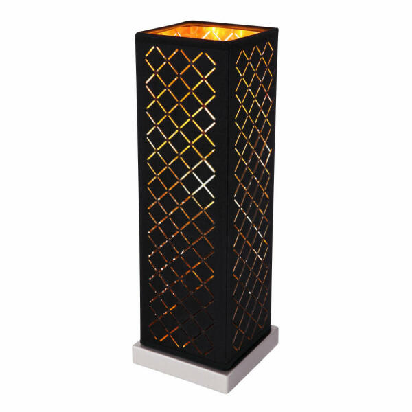 Asztali lámpa matt króm alaplapon fekete-arany textil búrával, mely bemetszésekkel van dekorálva. Bluetooth hangszóróval szerelve. hosszúság x szélesség x magasság:110x110x350, exkl. 1xE14 40W 230V Használt feszültség: 230V Fényforrás teljesítménye (Watt): 40W Fényforrás foglalata: E14 Foglalatok száma: 1 Magasság: 350mm Szélesség: 110mm Hosszúság: 110mm Szállítási i