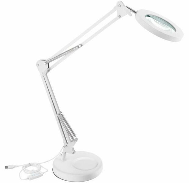 Nagyítóval ellátott asztali lámpa. 3 választható fényszín: hideg fehér (7500K) - nappali fehér (4500K) - meleg fehér (2900K). Dimmelhető - 10 fokozatú fényerősség. A nagyítóüveg 5-szörös nagyítást biztosít. A nagyító átmérője: 10,5 cm. A lámpa asztalon állítható vagy bilinccsel rögzíthető. Változó színhőmérséklet és dimmelés a kábelen lévő kapcsolóva