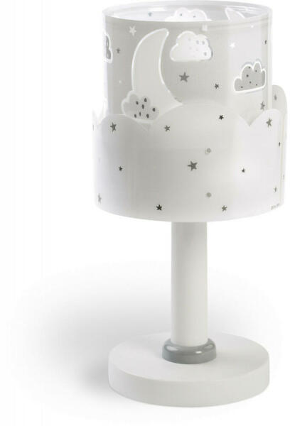 Éjszakai égbolt dekoros gyerek szobába illő lámpa hold és felhő motívummal. A lámpa fehér színű műanyag vázzal és szürke és fehér színű műanyag búrával rendelkezik. A motívumok körvonalai világítanak a sötétben. A lámpa vezetékre szerelt kapcsolóval rendelkezik.