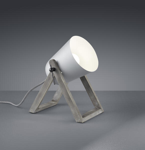 A nem szokványos Marc asztali lámpa a Trio gyártótól származik, a lámpa szürke natúr fából és szürke fémből készült. A lámpa díszes fehér-fekete tápkábellel rendelkezik, melyen egy kapcsoló található.