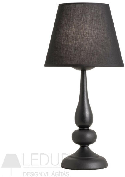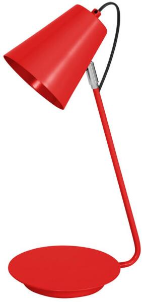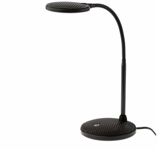 Modern stílusú, fekete színű íróasztali lámpa, fém vázzal, szatinált műanyag búrával, a lámpatesten kapcsolóval. A lámpa feje állítható, illetve SMD LED fényforrást tartalmaz.