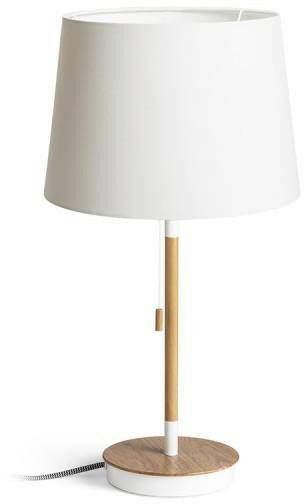Asztali lámpa textil ernyővel és talpon beépített USB porttal. A talp utánzat bükkfából készült fehér lakkos részletekkel. Alkalmas LED E27 fényforrásokhoz.