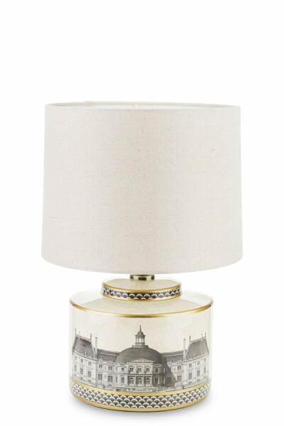 Asztali lámpa textil ernyővel és fém talppal. Alkalmas LED E27 fényforrásokhoz.