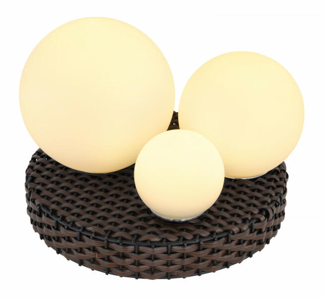 Asztali lámpa világosszürke rattan talp, fehér akril gömb búrákkal. DM: 8cm, 12cm, 15cm, Schalter, Ø:250, M:170, inkl. 1xLED 11,6W 230V, 757lm, 3000K