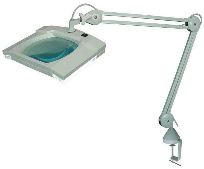 LED asztali lámpa nagyítóval. A lencse mérete: 190 × 155 mm. Nagyítás: 5 dioptria. LED-ek száma: 80. Az asztal széléhez van rögzítve.