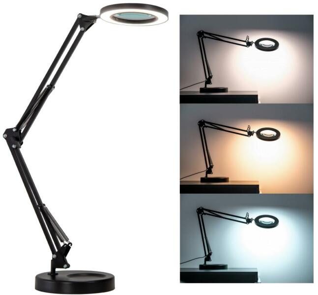 Nagyítóval ellátott asztali lámpa. 3 választható fényszín: hideg fehér (6000K) - nappali fehér (4200K) - meleg fehér (3000K). Dimmelhető - 10 fokozatú fényerősség. A nagyító 5x nagyít. A nagyító átmérője: 10,5 cm. A lámpát asztalra kell helyezni vagy rögzíteni egy bilinccsel. A színhőmérséklet és a fényerősség változtatása a kábelen lévő kapcsolóval. Tápe