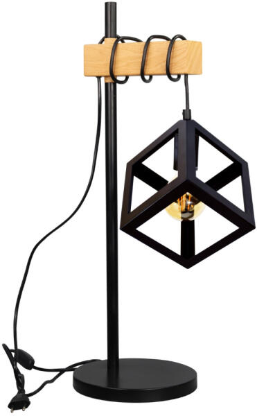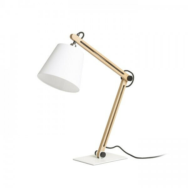 Asztali lámpa fa állítható kartámasszal lakkolt fém talppal és textil ernyővel. Tartalmaz egy fekete fonott tápkábelt.