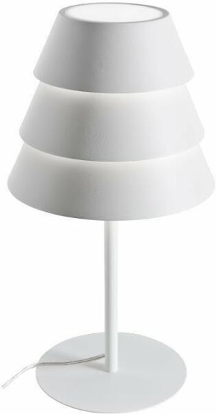 Design asztali lámpa, matt fehérre festett fém szerekezettel és búrával, vezetékre szerelt kapcsolóval. A búra gyűrű szerű rétegei közül átszűrődő fény, különleges hangulatot varázsol a helyiségbe.