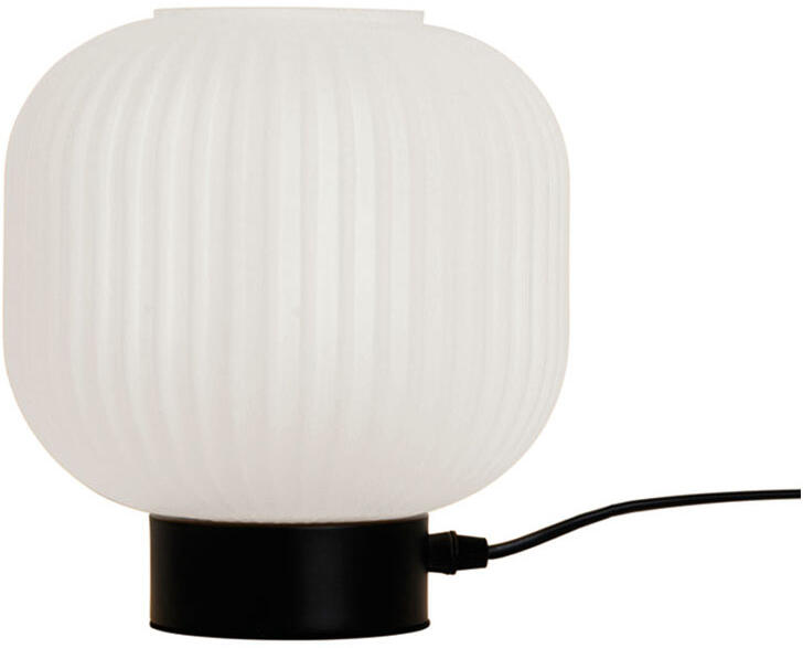 Asztali lámpa lámpa fehér üveg búrával és fekete szerelvényekkel. Letisztult és modern kialakítása elegáns megvilágítást biztosít bármely térben...