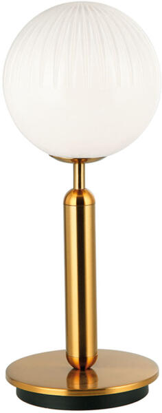 Asztali lámpa opál fehér, fényes és gravírozott üvegbúrával, arany matt szerelvényekkel. Elegáns és letisztult dizájn, amely tökéletes kiegészítője lehet modern vagy klasszikus stílusú tereknek...