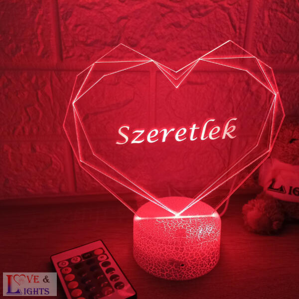 Szív alakú 3D LED illúzió lámparemek ajándék mely használható éjjeli fényként, hangulatvilágításként, dekorációként, és bluetooth-os zenelejátszóként is. 3d lámpáink előnyei: különböző színekben világít automatikus színátmenet is beállítható egyedi gravírozású akril lap személyre szabható egyedi felriattal több mint 200 választható lámpa minta többf