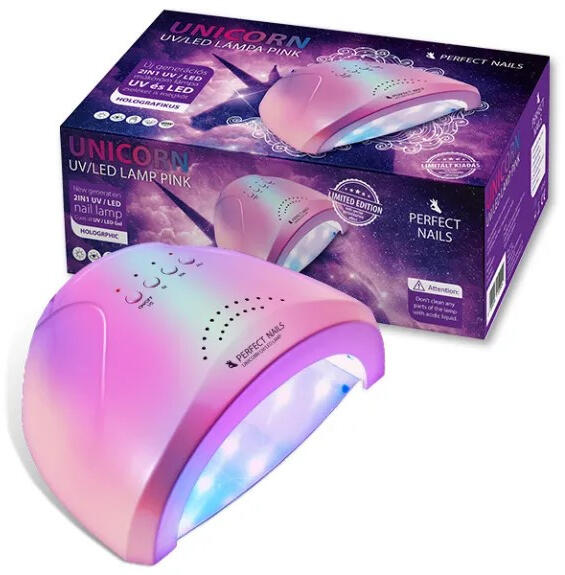 Műkörmös UV/LED Lámpa - Unikornis - Pink Holografikus csillogású, univerzális, 48 Wattos UV/LED lámpa két féle színben, ami a 30 darab energiatakarékos LED izzóknak és az alacsonyan elhelyezett szenzoroknak köszönhetően segíti az anyag tökéletes kötését a hüvelykujjon is. Mágneses, tükrös talpa levehető. Limitált kiadás!Okos szenzorFényerősség felező és dupla seb