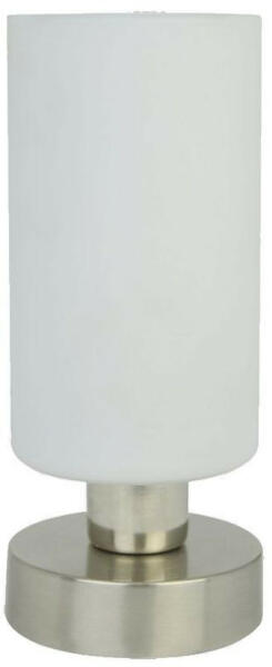 Szatinált nikkel színű fém asztali lámpa hengeres opál üveg búrával, 1db E14-es foglalattal, vezetékre szerelt kapcsolóval. A lámpa fényforrást nem tartalmaz.