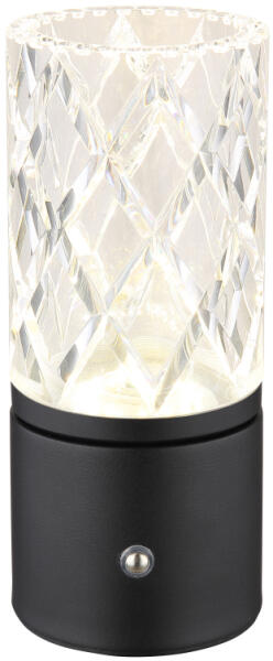Újratölthető asztali lámpa fém fekete matt, átlátszó akril, kábel PVC fekete, érintő kapcsoló, dimmelhető, fokozatmentesen állítható érintéses dimmer, színrögzítés, tartozék: CR18650, ø:80mm, M:190mm, LED 2.5W 5V, 243lm forrás, 185lm kimenet, CCT 2700