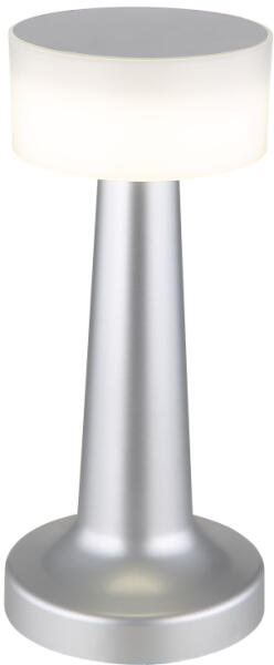 Újratölthető asztali lámpa műanyag nikkel/fehér, kábel PVC fekete, érintéses be/ki kapcsoló, fokozatmentes érintéses dimmer, színrögzítés, akku:CR18650 800mAh 3.7V, töltési idő kb. 2 óra, ø:95mm, M:215mm, LED 1W 230V, 100lm forrás, 55lm kimenet, CCT 27