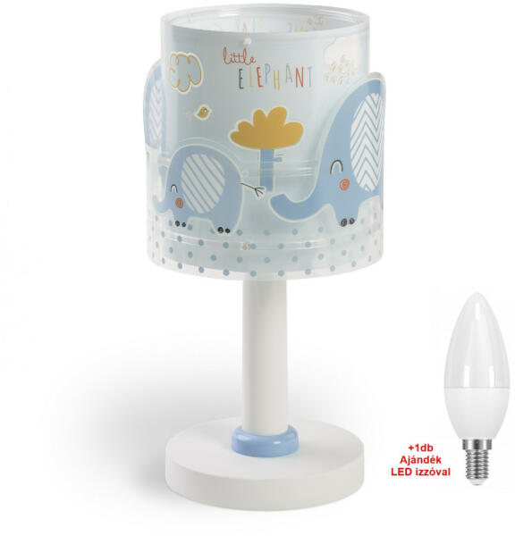 Elefánt dekoros gyerek szobába illő lámpa fehér színű műanyag vázzal, belül kék, kívül átlátszó alapon mintás műanyag búrával. A lámpa vezetékre szerelt kapcsolóval rendelkezik.