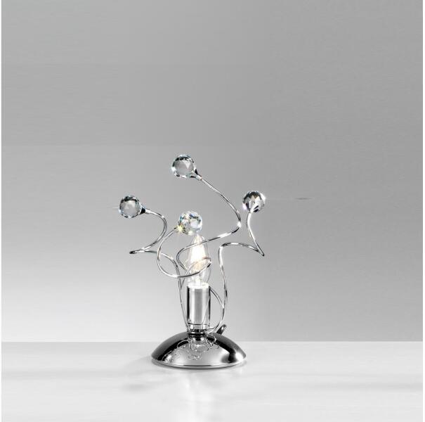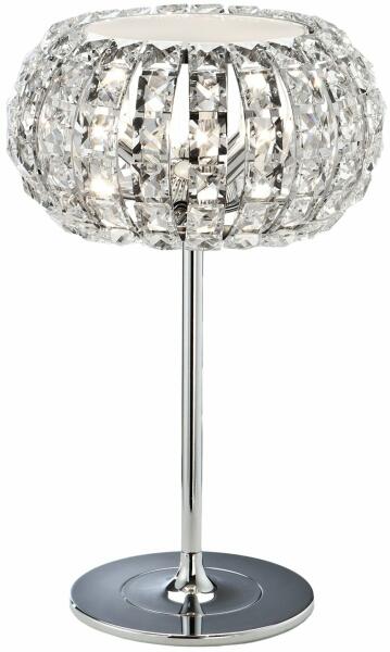 Asztali kristály lámpa 3 izzóval. Fém váz króm felületel. A búra átlátszó négyzet alakú vágott kristályszerű darabokból áll, opálüveg búrával. A lámpát felülről izzó világítja meg. A Diamond család különböző méretű függőlámpákból, falikarokból, különböző méretű mennyezeti lámpákból, állólámpákból és asztali lámpákból áll.