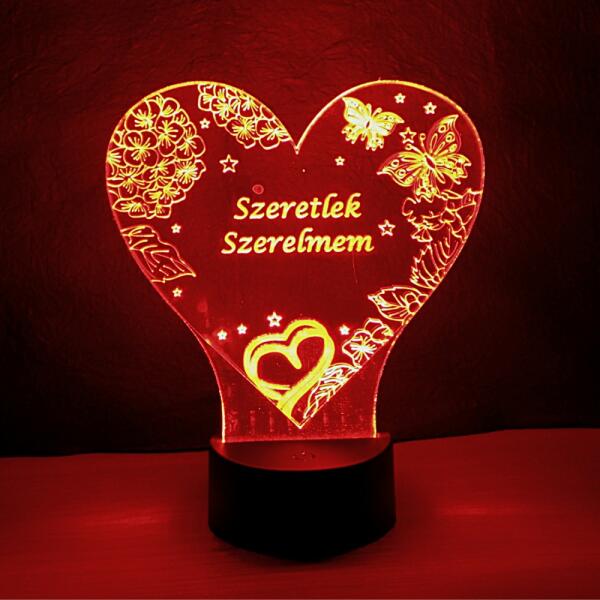 Szív alakú 3D LED illúzió lámparemek ajándék mely használható éjjeli fényként, hangulatvilágításként, dekorációként, akár kültéri világításként napelemes talppal. 3d lámpáink előnyei: különböző színekben világít automatikus színátmenet is beállítható egyedi gravírozású akril lap személyre szabható egyedi felriattal több mint 200 választható lámpa m