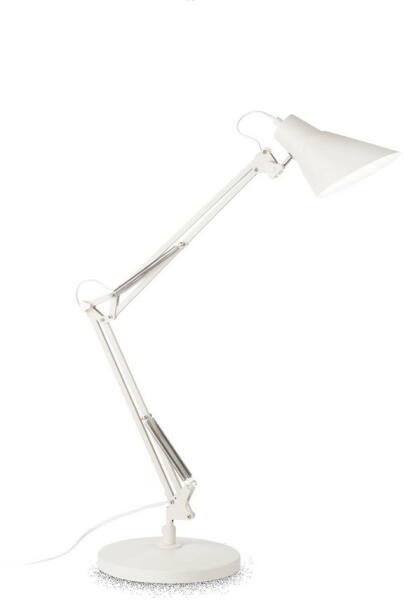 Fehér színű fém vázas íróasztali lámpa több ponton állítható karral és billenthető fejjel, vezetékre szerelt kapcsolóval.