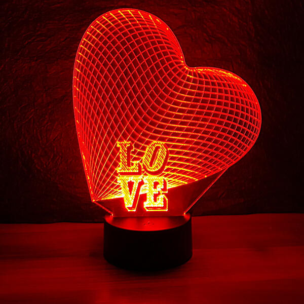 Szív alakú 3D LED illúzió lámparemek ajándék mely használható éjjeli fényként, hangulatvilágításként, dekorációként, akár kültéri világításként napelemes talppal. 3d lámpáink előnyei: különböző színekben világít automatikus színátmenet is beállítható egyedi gravírozású akril lap személyre szabható egyedi felriattal több mint 200 választható lámpa m