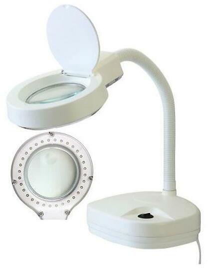 LED asztali nagyító állványon. Bifokális üveglencse 90 mm átmérőjű. Dioptriák száma: 3/8 dioptria. LED-ek száma: 15. Munkalapra helyezendő. A lencse alapnagyítása 1,75x, egy része (kb. 20 mm) pedig 3x-os nagyítású.