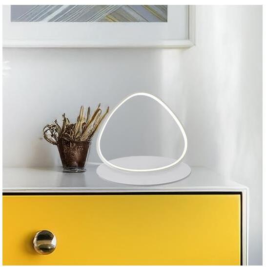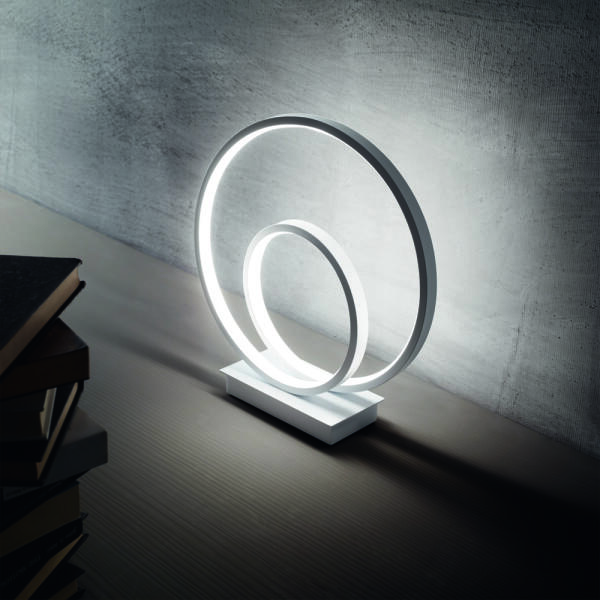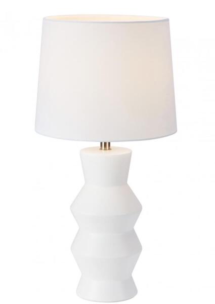 Fehér színű fém vázas asztali lámpa opálos gumi betétes búrával, beépített, meleg fehér fényű LED fényforrással, vezetékre szerelt kapcsolóval.