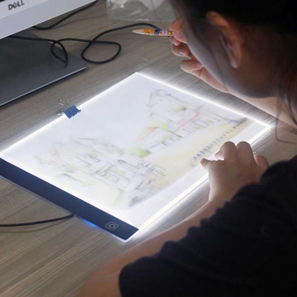 Ultravékony LED rajztábla A4 méret 5W Ideális stencilezéshez, 2D animációhoz, kalligráfiához, dombornyomáshoz, tetoválás átmásolásához, rajzoláshoz stb. Szemkímélő technológia, villogásmentes, szuper fényes, környezetbarát LED. Kiszűri a szemet károsító fényt. Érintőkapcsoló a bekapcsoláshoz és a fényerő szabályozásához. Kompakt és elegáns kivitelben. A LE