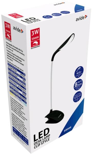 Avide LED Asztali Lámpa Csíptethető Fekete 3W Biztosítson fényt íróasztalán az Avide Csíptethető asztalilámpájával. A lámpa egyszerű, minimalista kialakításával, igazán modern hatást biztosít helyiségeinek. A 3W-os teljesítményű, hideg fehér színhőmérsékletű, fényerőszabályozható LED asztali lámpák bárhova könnyen felhelyezhetők, hiszen csíptethető talppal