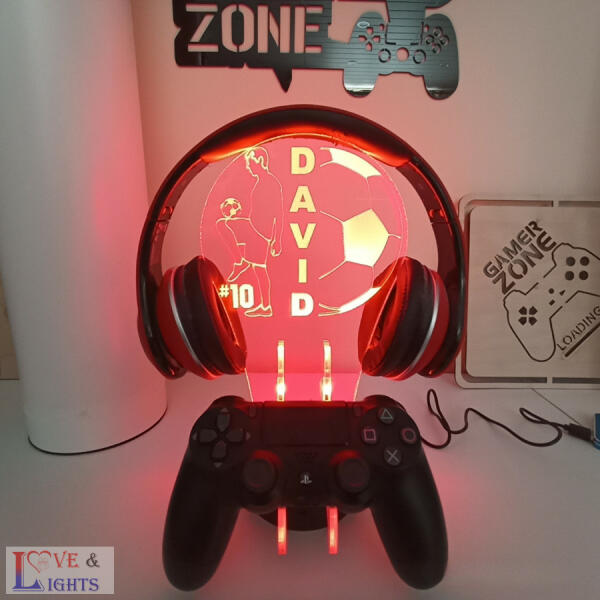 Gamerek asztaláról nem hiányozhat, egy kontroller és fülhallgató tartó állvány, melyen ps vagy xbox konzoljaikat tárolhatják. Névre szóló egyedi, ajándék, mely remek hangulatvilágítást biztosít. Ps / xbox kontroller és fülhallgató tartó állvány, mely különböző szíenkben világít, és akár a saját gamertagunk lehet belegravírozva a lámpába. Különleges, egyedi
