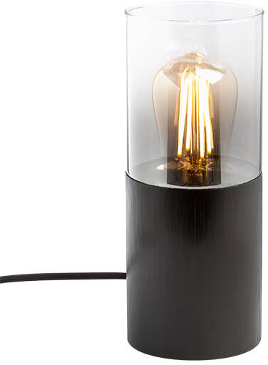 Súrolt felületű, fekete színű alumínium és fém vázas asztali lámpa henger alakú, füstszínű üveg búrával, vezetékre szerelt kapcsolóval.
