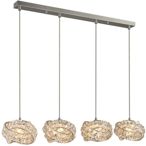 Kristály elemekből álló, csavart búrájú, design stílusú, több izzós, króm színű függeszték. A magasság adatánál a maximális belógást adtuk meg, mely a huzallal csökkenthető. Halogén és LED fényforrással is használható, amely nem tartozék. Specifikációk:Gyártó: AZzardo Cikkszám:: AZ-2105 Foglalat: 4 x G9 Méret (ma x sz x mé): 1200 x 870 x 160 mm IP-védettség:
