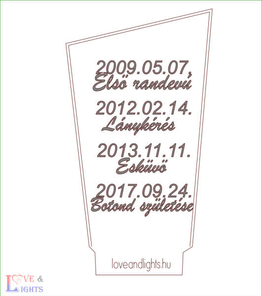 Vannak olyan dátumok, melyek nagyon fontosa az életetekben? Örökítsétek meg ezt egy szép emlélámpával, egy egyedi 3D lámpával! Az már csak extra, hogy így többet nem felejted el a dátumokat ;) Egyedileg gravírozott ajándék, akár Születésnapra, Névnapra, Valentin napra, vagy Évfordulóra. A kép csak látványterv, más, tetszőleges szöveg is kérhető rá. Pl: első talá