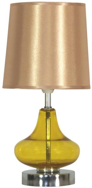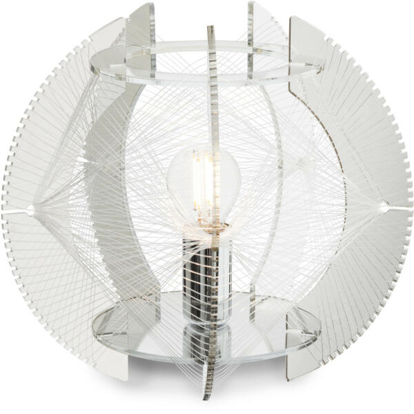 Fényer króm színű fém vázas asztali lámpa fényes akril lamellás, áttetsző nejlon szállal dekorált búrával, vezetékre szerelt kapcsolóval.