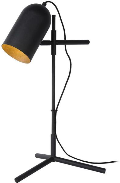 Fekete színű fém vázas íróasztali lámpa több ponton állítható karral és billenthető fejjel, vezetékre szerelt kapcsolóval.