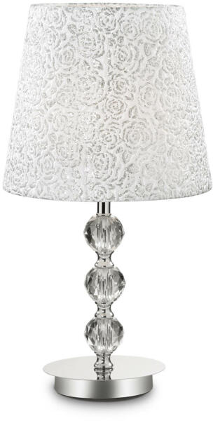 Elegáns, letisztult vonalak jellemzik ezt a lámpacsaládot. Króm szerkezet, kristály gyertyatartó. Látványos egyben klasszikus szövet búra, virág mintával. A lámpa magassága 465mm.