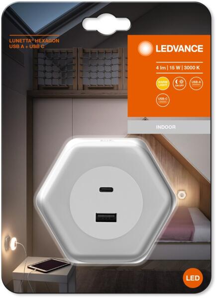 Ledvance LED éjszakai fény Jellemzők:Fényszín: melegfehérSzínhőmérséklet: 3000 KFunkció: fényérzékelésSzabályozható: nemNévleges feszültség: 220-240 VAnyag: műanyagSzín: fehérSugárzási szög: 110 °Fényhasznosítás: 18 lm/WSzínvisszaadás CRI: 80Átlagos élettartam: 30 000 óraLámpatest fényáram: 4 lmLámpatest teljesítmény: 15Védettség: IP20Hosszúság méret: