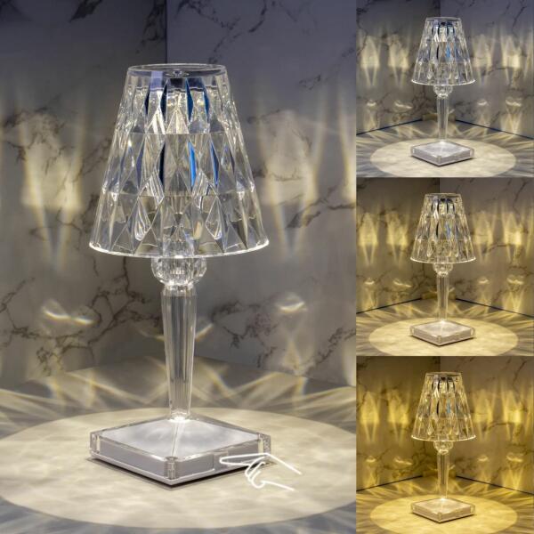 Crystal 3 színű Design Led lámpa érintőkapcsolós Akkumulátoros Led asztali lámpa USB - Ernyő A lámpatest akril anyagból készült, amely jó fényáteresztő képességgel és meleg és romantikus fényeffektussal rendelkezik. A lámpa tetejének megérintésével be-/kikapcsolhatja és beállíthatja a fény színét. Speciális 3D hatás olyan, mint a gyémánt. Világítsa be otthon