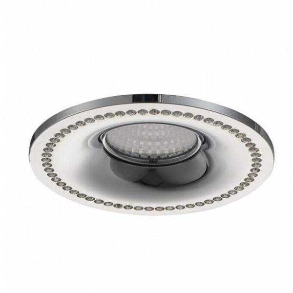 Dekoratív beépíthető lámpa alumíniumból. A lámpatestet kör alakban kristályok díszítik. Kivágási átmérője 7cm, magassága szerelvények nélkül 2,5cm. Fényforrást nem tartalmaz.