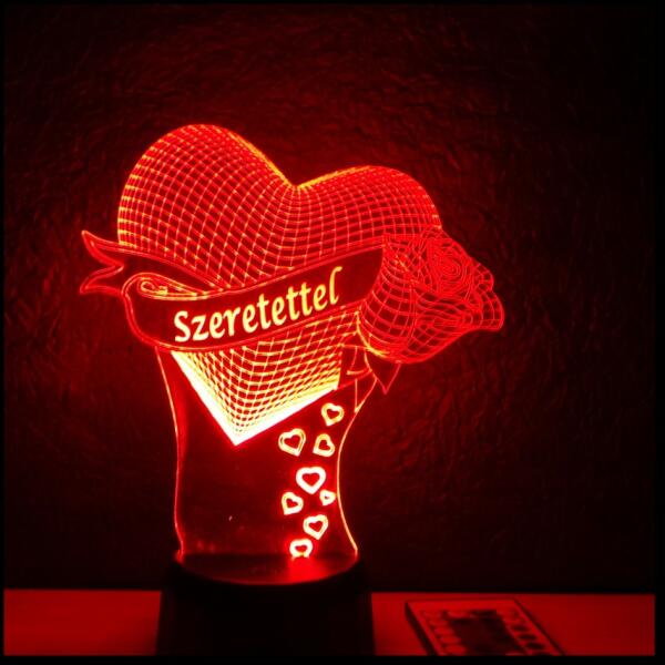 Szív alakú 3D LED illúzió lámparemek ajándék mely használható éjjeli fényként, hangulatvilágításként, dekorációként, akár kültéri világításként napelemes talppal. 3d lámpáink előnyei: különböző színekben világít automatikus színátmenet is beállítható egyedi gravírozású akril lap személyre szabható egyedi felriattal több mint 200 választható lámpa m