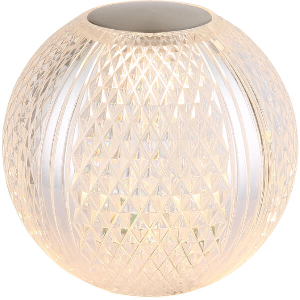Asztali lámpa átlátszó akril, nikkel műanyag, fekete PVC kábel, érintéses be/ki kapcsolás, érintéses dimmer, memória, CR18650 1200mAh 3.7V, töltés kb. 4 óra, világítás kb. 4-6 óra, ø: 120mm, M: 112mm, LED 2W 230V, 180lm forrás, 85lm kimenet, 3000K