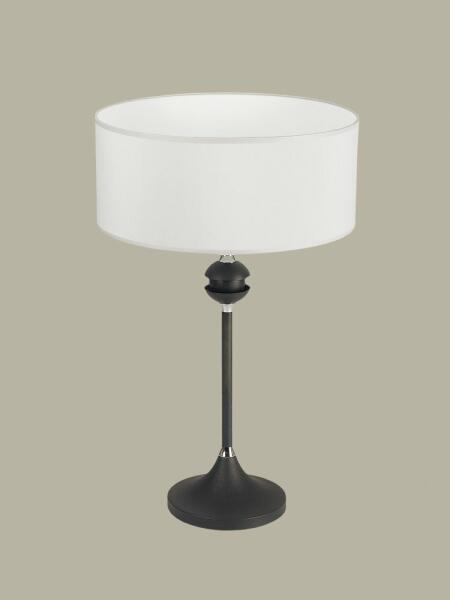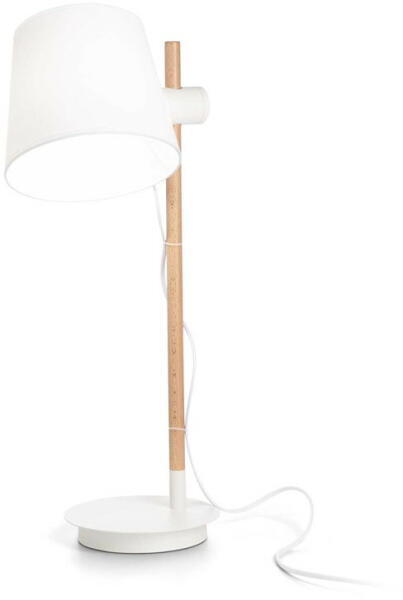 Fehér színű fém talpas komód lámpa natúr fa rúddal és fehér színű textil bevonatos PVC búrával, vezetékre szerelt kapcsolóval. A lámpa búrája a rúdon fel-le mozgatható, akár olvasó lámpának is használható.