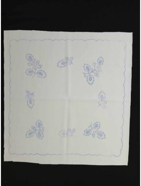 50*50 (szegés, cakkozás után 46x46) centiméteres, előrajzolt, hímezhető terítő. Az előrajzolt kézimunka a legrégebbi múltra visszatekintő, hagyományos magyar hímzésfajta.