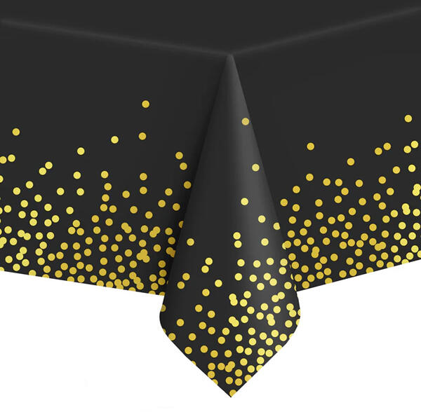 Eldobható, papír asztal terítő. Mérete: 1,37 méter x 2,74 méter. Színe: fekete. Arany konfetti mintákkal.